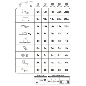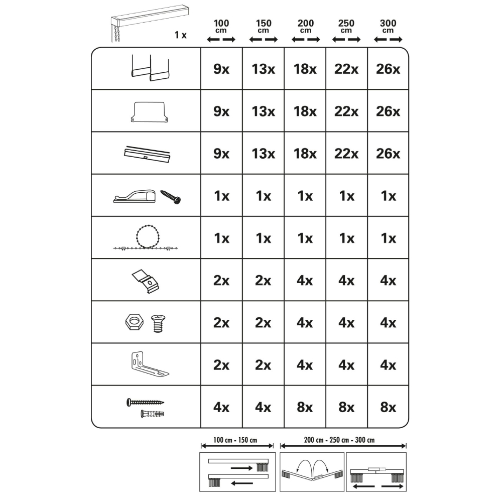 - Ab 200 cm Schienenbreite: Oberschiene geklappt, Lamellenpaket geteilt