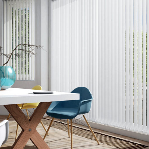 Die weiße, pulverbeschichtete Metall-Oberschiene sorgt für Stabilität und eine elegante Optik. Die Stofflamellen aus 100 % Polyester (Breite: 127 mm) sind pflegeleicht, robust und langlebig – perfekt für den täglichen Einsatz.